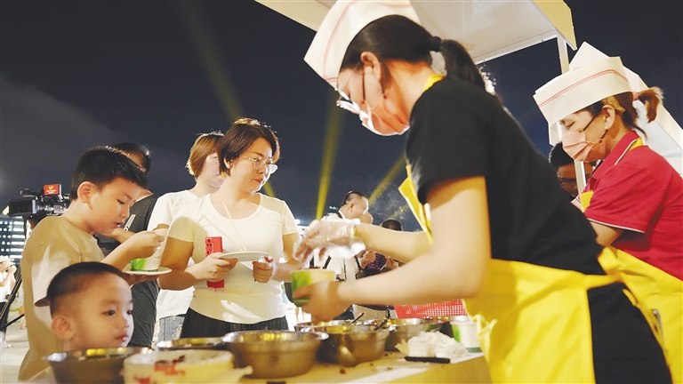 品鉴会现场集中展示了海口龙塘地区的黑猪肉粽、百年粉、猪血肠、南椰粉、薏粑、豆腐脑、炸饼、年糕等八大美食,以及琼山区琼肴佳话系列产品以及特色农副产品。在品尝活动现场,市民游客纷纷停下脚步品尝。