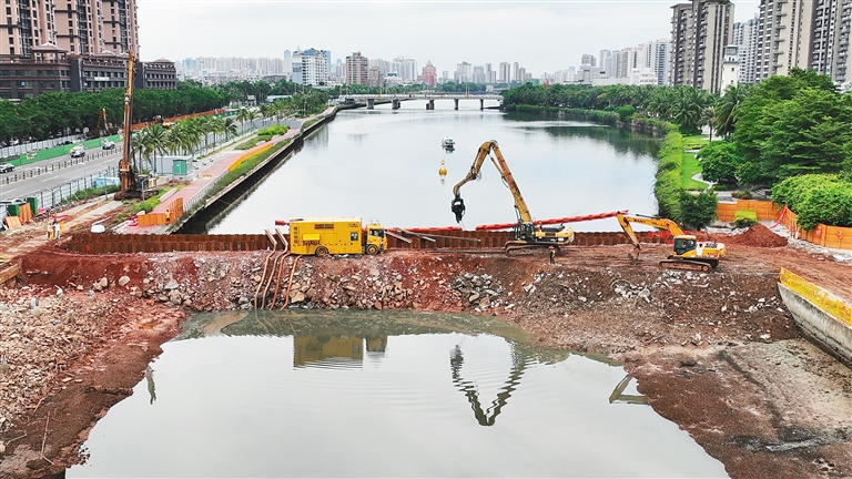 6月23日,海口白龙路至海甸岛下穿通道工程项目加紧建设。目前,该项目已经完成河面拦截施工。