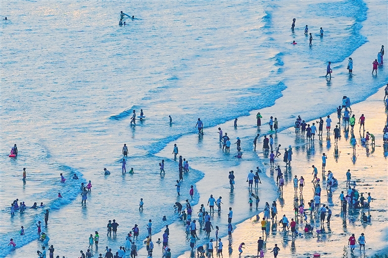6月22日傍晚,正值端午假期,三亚湾畔,夕阳斜照,成千上万的市民游客陪伴家人来到这里,享受惬意的假日时光。
