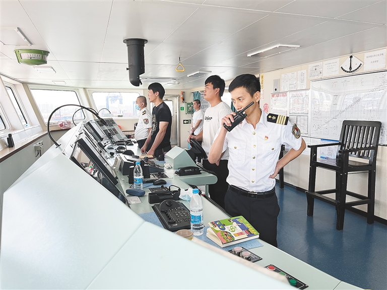 “左满舵”“正舵”“微速前进”……6月21日10时许,海口秀英港区引航检疫锚地内,海南省船舶引航站一级引航员唐民州,正站在一艘国轮的驾驶舱内,为该船引航。