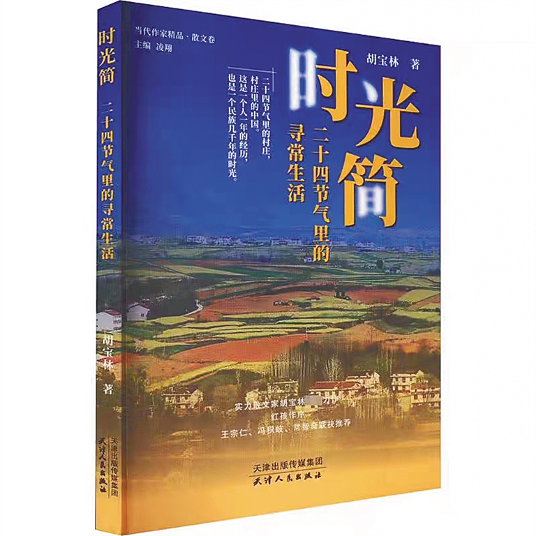 《时光简:二十四节气里的寻常生活》的封面是一幅乡村田园图,图中村落鸡犬相闻,树木掩映;田野阡陌纵横,黄绿相间;整个乡村与蓝天交织在一起,似乎,这份乡村的宁静与美好从未褪色。该书封面与内容相互交织,作者胡宝林是陕西本土作家,他用优美的语言和细腻的笔触来记录陕西乡村的人、事、物,将曾发生或正发生在这块土地上的故事向读者娓娓道来。