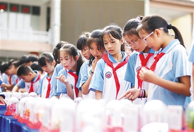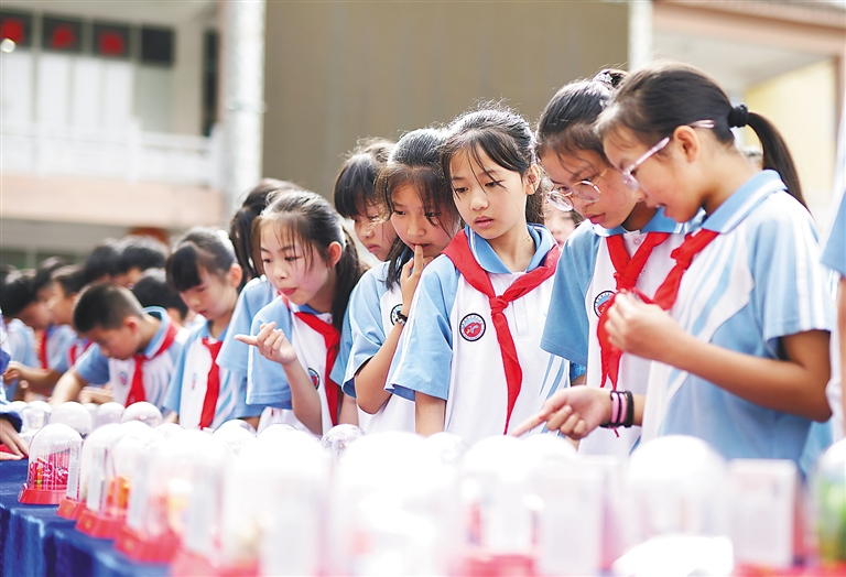 图为小学生在贵州省黔东南苗族侗族自治州丹寨县“6·26国际禁毒日”宣传教育活动现场通过仿真毒品模型识别毒品。新华社发