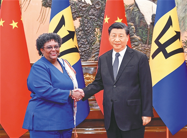 习近平指出,巴巴多斯是东加勒比地区最早同中国建交的国家,也是中国在这一地区的好朋友、好伙伴。中巴两国虽然远隔重洋,但志同道合、携手同行,双边关系不断深化发展。中国正在以高质量发展推进中国式现代化,这将为巴巴多斯发展和中巴合作带来新机遇,欢迎巴方搭乘中国发展“快车”,同中方构建更紧密中巴命运共同体。