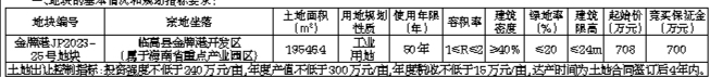 二、本次挂牌出让设有底价,按照出价最高且不低于底价者得的原则确定竞得人。三、开发建设要求:(一)该宗地拟作为装配式产业项目使用,出让地块须统一规划、统一开发,建设须符合《临高金牌港经济开发区控制性详细规划》要求,生产配套满足规划要求,厂房风貌满足规划要求。(二)竞得人须在签订《挂牌出让成交确认书》后,5个工作日内与临高县工业和信息化服务中心签订《海南省产业项目发展和用地准入协议》,20个工作日内与临高县自然资源和规划局签订《国有建设用地使用权出让合同》,并严格按照约定内容进行开发建设,否则将承担相关违约责任。(三)竞得人出资比例结构、项目公司股权结构未经土地所在地人民政府批准不得发生变动。(四)竞得人取得土地使用权后,应依法建设使用土地和管理土地,切实履行《国有建设用地使用权出让合同》中的权利和义务。四、竞买申请:(一)竞买人资格。1.中华人民共和国境内外的法人、自然人或其他组织(法律另有规定者除外)均可申请参加竞买(注:失信被执行人不得参加本次竞买),申请人应单独申请,不接受联合体竞买。2.经政府相关部门核实,存在下列情形之一的,申请人及其控股股东禁止参加竞买:(1)存在伪造公文骗取用地和非法倒卖土地等犯罪行为的;(2)存在非法转让土地使用权等违法行为的;(3)因企业原因造成土地闲置一年以上的;(4)拖欠土地出让金的。(二)本次挂牌出让的详细信息、风险提示和具体要求等,见挂牌出让手册及其他相关文件。手册和文件可从海南省建设用地使用权和矿业权网上交易系统(以下简称网上交易系统,网址:http://lr.hainan.gov.cn:9002)查看和打印。(三)有意向的竞买人可登录网上交易系统提交竞买申请,按要求上传竞买申请文件。本次交易不接受电话、邮寄、书面、口头等其他形式的申请。竞买申请时间:2023年6月28日08:30至2023年7月26 日17:00(以网上交易系统服务器时间为准,下同)。(四)竞买人在网上交易系统提交竞买申请时,须按照挂牌出让手册的有关规定足额缴存竞买保证金或使用银行保函方式提供竞买保证金。竞买保证金到账截止时间:2023年7 月26日17:00。(五)竞买人的竞买申请文件审核通过,且竞买保证金已按要求交纳的,网上交易系统自动发放《竞买资格确认书》,确认其获得竞买资格。竞买资格审核时间:2023年7月18日08:30至2023年7月26日17:30。五、挂牌报价时间及网址: (一)挂牌报价时间为:2023年7月18日08:30至2023年7月28日9:30。(二)挂牌网址:网上交易系统(http://lr.hainan.gov.cn:9002/)。(三)网上挂牌报价时间截止时,无竞买人报价,挂牌活动自动结束;有竞买人报价,网上交易系统限时5分钟在线询问,有竞买人在此规定时限内表示愿意参与网上限时竞价的,系统自动进入网上限时竞价程序,以竞价方式确定竞得人。六、该地块安置补助费已落实到位,地上附着物已清表,土地权利清晰,无法律经济纠纷;不存在土壤污染,符合土壤环境质量要求;宗地已基本完成土地平整,地块周边可以满足施工建设所需的水、电供应,相关设备、机械可以进场施工,具备动工开发必需的条件。七、本公告未尽事宜详见《临高县国有建设用地使用权挂牌出让手册》以及网上交易系统提供的相关文件,其所载内容为本公告的组成部分。八、咨询方式:洪先生 18084630580;查询网址:http://zw.hainan.gov.cn/ggzy/、http://lr.hainan.gov.cn、http://lr.hainan.gov.cn:9002/。