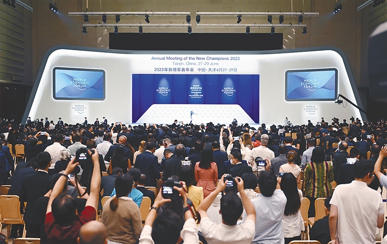 第十四届夏季达沃斯论坛于6月27日至29日在天津举行,论坛主题为“企业家精神:世界经济驱动力”。图为6月27日拍摄的开幕式。