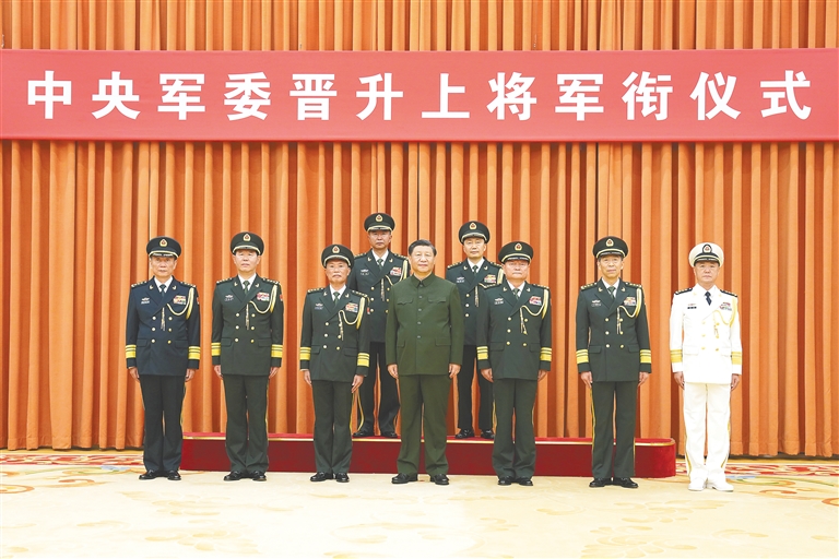 晋衔仪式在嘹亮的军歌声中结束。随后,习近平等领导同志同晋升上将军衔的军官合影。