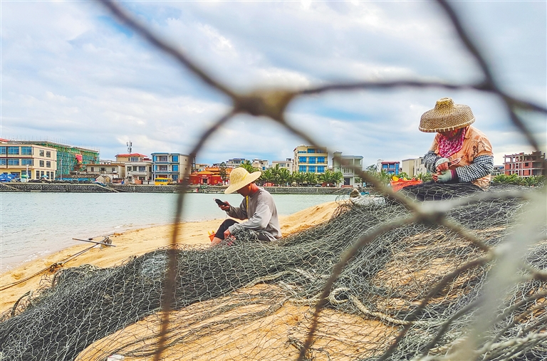 6月27日,澄迈县老城镇东水港村渔民利用休渔期,忙着修补渔船,整理渔网,以便休渔期结束后,更好地开展捕捞生产。
