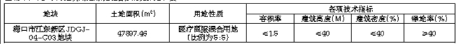 经海口市人民政府批准,海口市自然资源和规划局决定以挂牌方式出让一幅海口市江东新区JDGJ-04-C03地块的国有建设用地使用权。现将有关事项公告如下:一、出让宗地的基本情况和规划指标要求:(一)基本情况及宗地净地情况。本次挂牌出让的用地位于海口市江东新区JDGJ-04-C03地块,土地面积为47897.46平方米(71.85亩),土地用途为医疗卫生和其他商业服务业用地(医疗卫生用地占50%,其他商业服务业用地占50%),土地出让年限为医疗卫生用地50年,其他商业服务业用地40年。目前地块安置补偿落实到位、地上附着物已清表、土地权利清晰、无法律经济纠纷、土地开发利用规划条件明确、土壤无污染,具备动工开发必需的条件。(二)主要规划指标。海口市江东新区JDGJ-04-C03地块用地的规划指标情况详见下表: