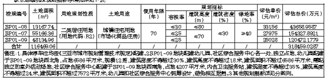 结合该宗地所在区位、土地用途及自持情况,本次拟出让宗地适用的基准地价情况如下:城镇住宅用地基准楼面地价为2780元/建筑m2,折合土地单价为463.33万元/亩(设定容积率为2.5)。根据有资质的土地评估中介机构评估,并经评估专家小组评审通过:1.控规BP01-05地块,土地单价为33156元/平方米(折合2210.40万元/亩),土地评估价为43658.9587万元;2.控规BP01-07地块,土地单价为27975元/平方米(折合1865万元/亩),土地评估价为154327.8921万元;3.控规BP01-09地块,土地单价为25028元/平方米(折合1668.53万元/亩),土地评估价为120472.1779万元。综上,该宗地的土地评估总价为318459.0287万元。