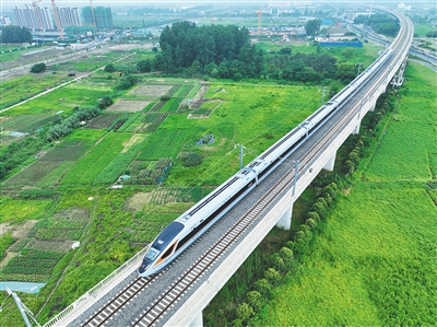 6月30日,在江苏扬州,一列动车组列车行驶在连淮扬镇铁路扬州段(无人机照片)。