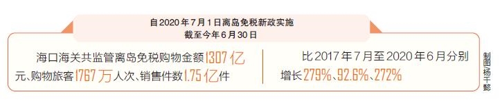 本报海口7月1日讯(记者周晓梦 通讯员杨刚 陈思琪 陈瑛琦)7月1日,海南日报记者从海口海关获悉,据统计,自2020年7月1日离岛免税新政实施,截至今年6月30日,海口海关共监管离岛免税购物金额1307亿元、购物旅客1767万人次、销售件数1.75亿件,比2017年7月至2020年6月分别增长279%、92.6%、272%。