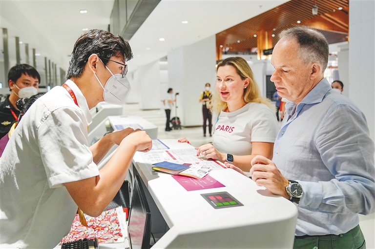 7月1日,在三亚凤凰国际机场国际航站楼,前往香港的外籍旅客在值机柜台值机。