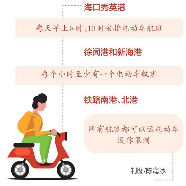 本报海口7月3日讯 (记者邵长春)海南日报记者7月3日从琼州海峡(海南)轮渡运输有限公司获悉,海安新港每天18时、20时、22时、24时安排电动车航班,每个航班最多运输72辆电动摩托车,当电动汽车也乘坐此航班时,相应减少电动摩托车数量。