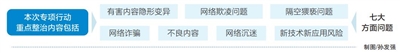 本次专项行动重点整治内容包括:有害内容隐形变异、网络欺凌问题、隔空猥亵问题、网络诈骗、不良内容、网络沉迷、新技术新应用风险等七大方面问题。具体包括利用视频剪辑等方式集中展示涉未成年人血腥暴力等画面、对未成年人进行“人肉搜索”,恶意传播泄露未成年人隐私的欺凌视频、以免费游戏装备、投票返现、盲盒抽取、粉丝抽奖等名义诱导未成年人加入群聊,诱骗转账汇款等。