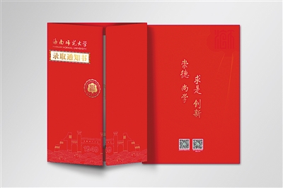 轻启封套,一如打开海南师范大学大门,映入眼帘的便是该校图书馆。新版录取通知书巧妙地运用了校门、图书馆等建筑的勾线图作为设计元素,让通知书更富有校园特色;且边框融合了黎锦花纹元素,更具海南风情。打开录取通知书仿佛置身于地处热带的海师校园,感受到校园的温暖明亮的氛围,嗅到书香。