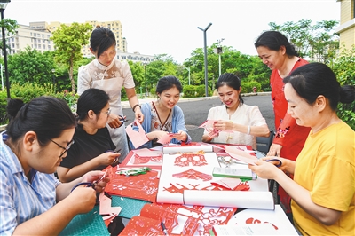 近日,在海口市琼山区凤翔街道桂林大社区综合服务中心,居民在老师带领下学习剪纸。