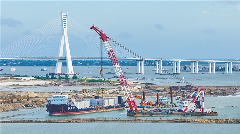 7月4日,文昌铺前中心渔港项目现场,工人在进行码头沉箱吊装作业。
