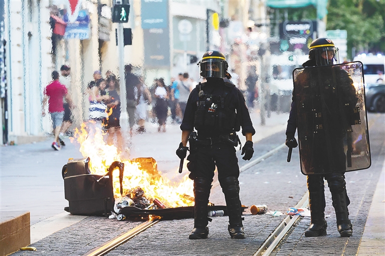 7月1日,在法国南部城市马赛,警察在街头维持秩序。