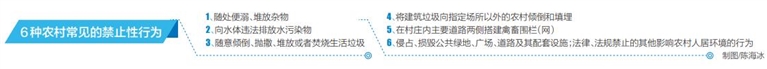 《规定(草案)》列举了6种农村常见的禁止性行为,包括随处便溺、堆放杂物;向水体违法排放水污染物;随意倾倒、抛撒、堆放或者焚烧生活垃圾;将建筑垃圾向指定场所以外的农村倾倒和填埋;在村庄内主要道路两侧搭建禽畜围栏(网);侵占、损毁公共绿地、广场、道路及其配套设施;法律、法规禁止的其他影响农村人居环境的行为。