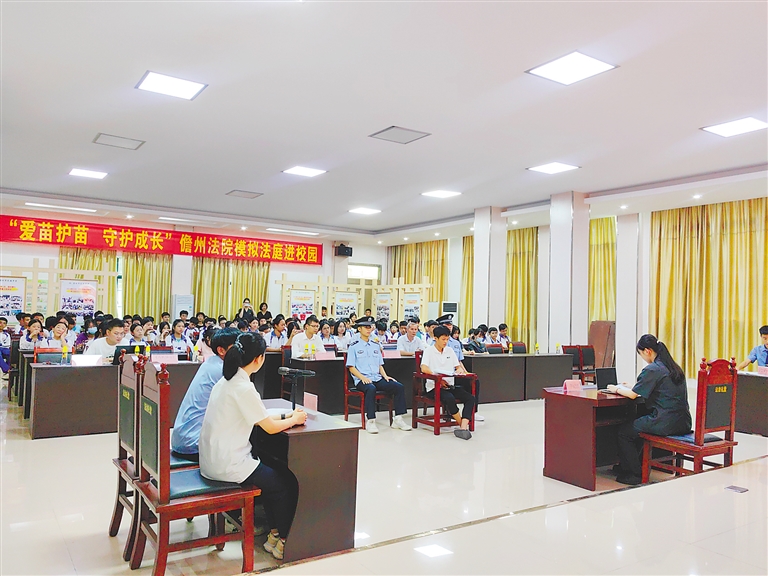 为进一步加强青少年法治教育和毒品预防教育,提高在校学生法律意识和防范毒品能力,深入贯彻落实《儋州市未成年人“护苗”专项行动方案》,7月5日下午,海南省儋州市人民法院以“爱苗护苗,守护成长”为主题,走进儋州市民族中学开展模拟法庭进校园活动,为学生们呈现了一次生动的“法治课堂”。