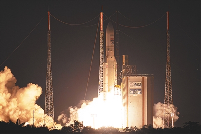 7月5日,在法属圭亚那库鲁航天中心,阿丽亚娜5型火箭发射升空。