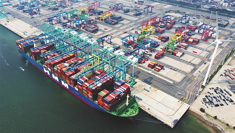 记者从天津港集团获悉,今年上半年,天津港集团完成货物吞吐量2.41亿吨,同比增长2.1%;集装箱吞吐量完成1135.3万标准箱,同比增长8%,再创历史新高。新华社记者 赵子硕 摄