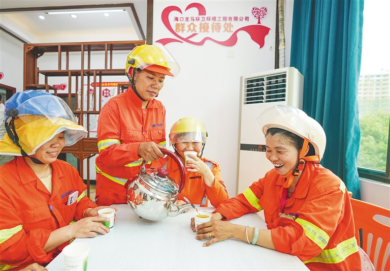 7月9日,在海口市龙华区金牛路的户外劳动者服务站点,环卫工人喝凉茶消暑解渴。炎炎夏日,为预防环卫工人户外作业中暑,海口各环卫公司组织管理人员和后勤保障人员制作绿豆汤、凉茶,为坚守一线的环卫工人送上清凉。本报记者 李天平 摄