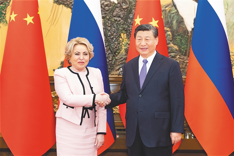 马特维延科表示,俄中全面战略协作伙伴关系符合两国利益和两国人民意愿,已达到历史最高水平并继续稳步发展。习近平主席今年3月对俄进行的成功国事访问为俄中关系进一步发展注入强劲动力。俄议会广泛支持深化俄中合作,愿同中国全国人大进一步加强交流对话,为落实两国元首共识提供法律保障。