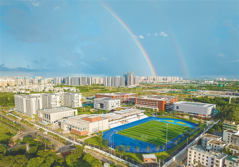 人大附中海口实验学校中学部项目建设正在有序推进。目前,该校独栋图书馆、食堂、网球场等已经建成,4栋宿舍楼错落有致。普通教室里,空调、多媒体教学设备安装完毕。该校将于今年秋季招生开学,将设置90个班,预计可提供4050个初、高中学位。