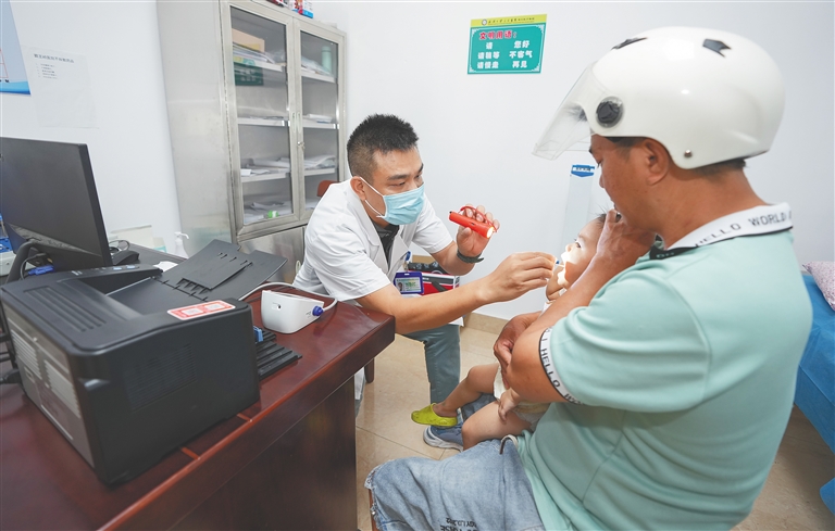 7月12日,在昌江黎族自治县医疗集团霸王岭分院,医生为患儿诊治。