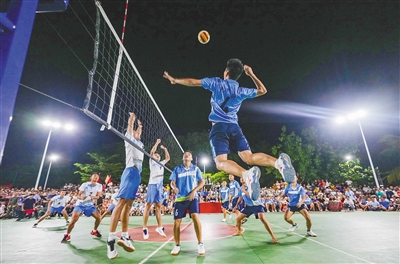 首场比赛由东道主中和镇代表队对阵海头镇代表队。在全场观众的加油声中,由农民、教师、餐馆经营者等临时组成的中和镇代表队,不负众望,拿下比赛。“大家来自各行各业,平时在一起打球不多,能赢球离不开对排球的热爱和对比赛的投入。”中和镇代表队队长戴正龙说。
