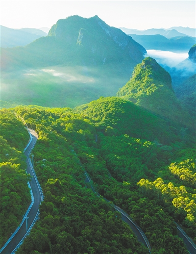 7月13日,俯瞰昌江山海互通旅游公路霸王岭至王下乡路段,云雾缭绕,风景如画。