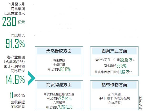 “总体经营指标良好,多项细化指标也透露出发展亮点。”海垦集团战略企划部相关负责人介绍,今年上半年,海南农垦各产业集团(含集团总部)累计利润总额同比增长14.6%,11家农场营收数据同比翻番,这是企业发展结构不断优化,新动能日益转换的直观例证。