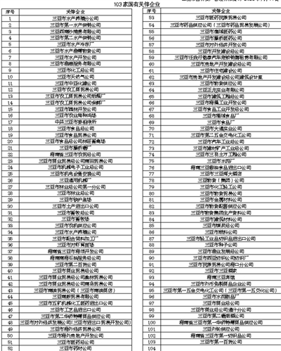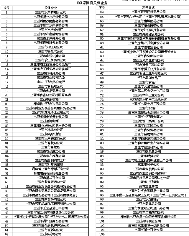 根据三亚市国有资产管理有限公司研究决定,拟对下属103家关停企业(详见下表)进行清算注销。请与以下103家国有关停企业有债权债务关系的单位和个人,根据《公司法》第一百八十五条“……债权人应当自接到通知书之日起三十日内,未接到通知书的自公告之日起四十五日内,向清算组申报其债权……”的规定,在本公告之日起45日内,带齐有关资料前来我公司办理债权债务相关手续。办公地址:三亚市解放路339号华庭八号9楼。联系人:丁冬梅。联系电话:0898-88985062。