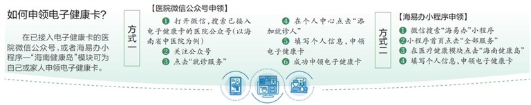 本报海口7月14日讯 (记者马珂)7月14日,海南日报记者从省卫生健康委获悉,为进一步推进“互联网+医疗健康”发展,提升便捷化、智能化、人性化的医疗服务水平,我省已完成电子健康卡的系统改造开发,并正式启动接入使用,解决医院“一院一卡”“重复发卡”“互不相通”等堵点问题,实现了区域健康服务协同和健康信息互认共享,为居民提供便捷高效的卫生健康服务。