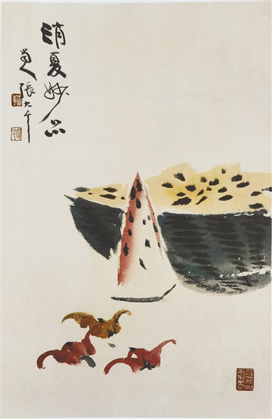 近现代著名画家张大千对夏天如何消暑纳凉有自己的见解,这在他笔下的《纳凉图》《消夏妙品图》等画作中可见一斑。如他的《纳凉图》创作于1930年,大小为51cm×29.5cm,纸本设色,图中有一挺拔大树,树旁依偎着一个高高的藤架,在树和藤架浓荫之下,两位士人对坐在巨石上,一士人袒胸露乳,手持一扇;另一士人手抚一琴。浓荫下,微风时拂,或弹琴取乐,或谈天说地,尽情享受天然纳凉之趣,惬意!他的《消暑妙品图》创作于1930年,大小为32.5cm×21cm,纸本设色,图中一小半绿皮黄瓤的西瓜、一小片红瓤西瓜、三个菱角自然摆放着,让人口馋。西瓜历来为消暑佳品,皮薄汁多,味甜而香,风味绝佳,食后“香浮笑语牙生水,凉入衣襟骨有风”(元·方夔《食西瓜》诗),烦暑顿消。