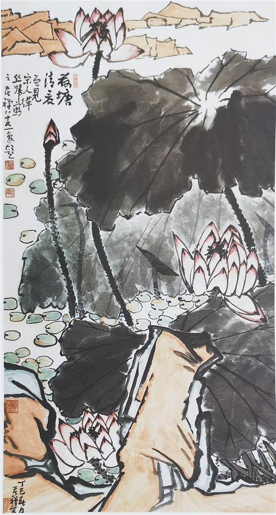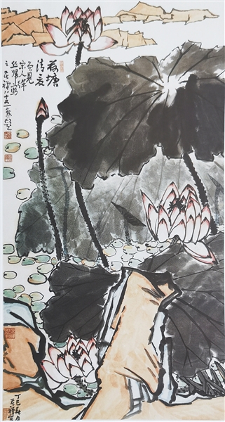 现代著名书画家李苦禅喜爱夏天的荷花,荷花是他笔下的创作题材之一,曾创作《荷塘夏色》《荷塘清夏》等荷花画作。如他的《荷塘清夏》创作于1977年,大小为129cm×69cm,纸本设色,画面展示荷塘田田荷叶,灼灼丽葩,翠盖红伞,风流丽质,绰约芳姿,美不胜收。细细品赏《荷塘清夏》,但觉荷风从画中扑面而来,颇有“荷花池畔暑气收”之感,足使炎炎夏日顿时减去了几分暑气,好不惬意。