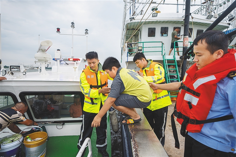7月16日,在文昌清澜港,海南省公安厅海岸警察总队第二支队民警帮助渔民安全撤离。