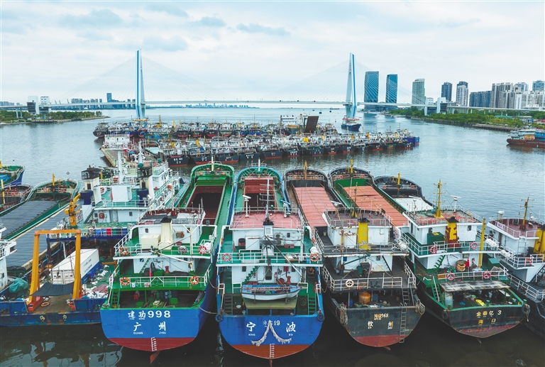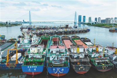 7月16日9时许,琼海潭门中心渔港,各类作业渔船整齐停放在指定停泊区内。