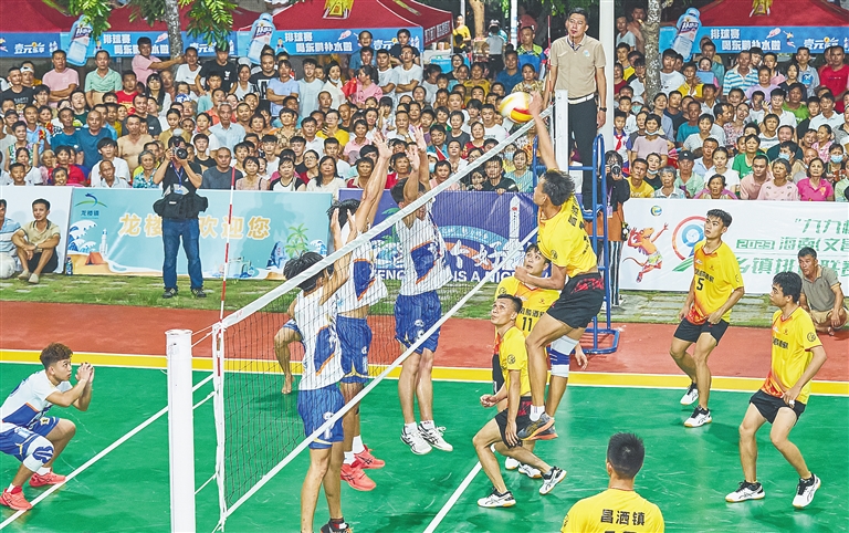 近日,2023年海南(文昌)乡镇排球联赛在文昌开打。来自海口、文昌、琼海和澄迈共20支乡镇男子排球队将进行男子九人制排球赛的激烈角逐,引来众多村民游客围观。