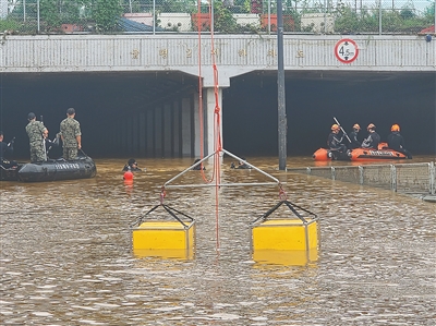 7月16日,在韩国忠清北道清州市,救援人员在被水淹没的地下车道进行搜救工作。