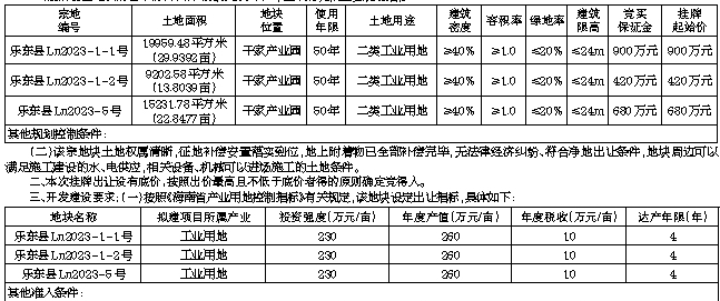 四、竞买申请:(一)竞买人资格:1.中华人民共和国境内外的公司、企业、其他组织及自然人均可参加竞买,法律、法规另有规定的除外。属境外法人或其他组织的,须提供境外公证部门的公证书。2.对发现并核实竞买人存在下列情形之一的,不得申请参加挂牌出让活动:(1)存在伪造公文骗取用地和非法倒卖土地等犯罪行为的;(2)存在非法转让土地使用权等违法行为的;(3)在乐东县内其他区域内取得土地使用权,但因企业原因造成土地闲置一年以上的;(4)开发建设企业违背出让合同约定条件开发利用土地的;(5)存在重大税收违法行为的;(6)失信被执行人。3.申请人须具备竞买条件,并按规定交纳竞买保证金,我局将在规定的时间内确认其资格,签发资格确认书。(二)交易资料获取方式:本次挂牌出让的详细信息和具体要求,见挂牌出让手册及其他相关文件。手册和文件可从海南省建设用地使用权和矿业权网上交易系统(以下简称网上交易系统,网址:http://lr.hainan.gov.cn:9002)查看和打印。也可到乐东黎族自治县抱由镇江北区自然资源和规划局大楼二楼土地储备整理中心现场领取。(三)竞买申请方式:本次交易活动竞买申请环节采取线下方式进行,有意向的竞买人按挂牌出让手册的具体要求报名参加竞买。不接受电话、邮寄、书面、口头等其他形式的申请。竞买申请地点:乐东县抱由镇江北区自然资源和规划局大楼二楼土地储备整理中心。竞买申请时间:2023年7月19日08时00分至2023年8月21日17时00分(以网上交易系统服务器时间为准,下同)。(四)竞买保证金、银行保函:竞买人须按照挂牌出让手册的有关规定将竞买保证金足额交入指定账户。本次竞买保证金的币种为人民币,不接受外币。竞买保证金不属于银行贷款、股东借款、转账和募集资金所得,并出具承诺。使用银行保函方式提供土地竞买保证金的,保函应为不可撤销、见索即付保函,担保金额应不少于全额土地竞买保证金,保证期限自保函开立之日起至挂牌交易活动结束后不少于60日;纸质保函需在竞买保证金到账截止时间前2个工作日送达。(详见手册)竞买保证金到账截止时间为:2023年8月21日17时00分。(五)资格确认:经审核,竞买申请人符合竞买资格,且竞买保证金已按要求交纳的,乐东黎族自治县自然资源和规划局将发放《竞买资格确认书》,确认其获得竞买资格。竞买资格审核时间:2023年7月20日08时00分至2023年8月21日17时30分。
