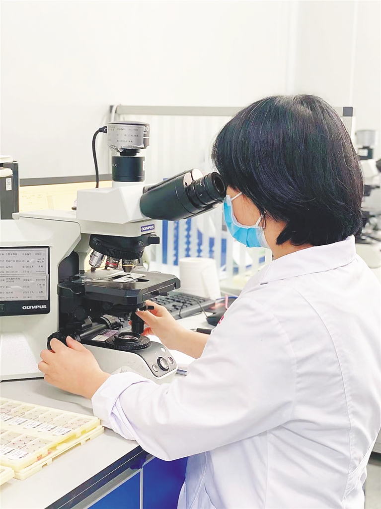 “这里的每一道工序,都是技术活。”徐海霞说,从取材、脱水、包埋、染色到制成一张优良的切片,对整个流程要求都很高。切片要薄如蝉翼、铺片平整无痕、染片核浆分明。“如果说CT是把整个人体进行了一层一层的观察,那么病理就是把病变部位的组织放大,一层一层地观察。”