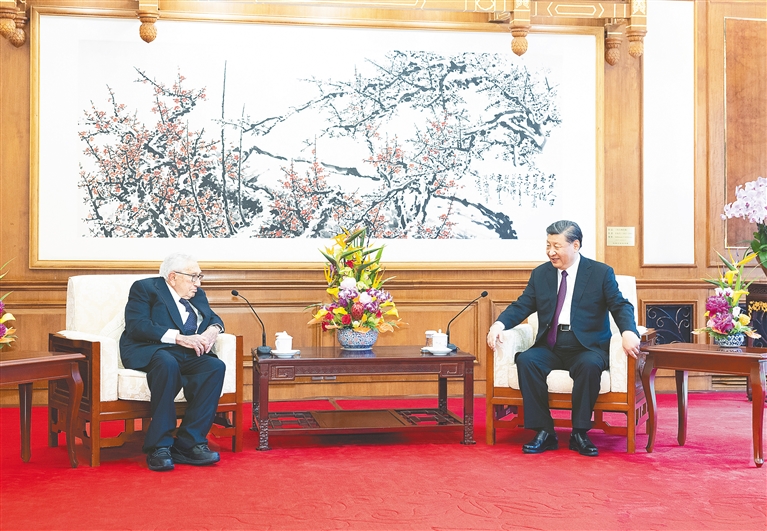 习近平指出,基辛格博士刚刚度过百岁生日,你访问中国已经一百多次。这两个“一百”加在一起,使你这次访华具有特殊意义。52年前,中美两国处在一个关键转折点,毛泽东主席、周恩来总理同尼克松总统和你本人以卓越的战略眼光,作出中美合作的正确抉择,开启了中美关系正常化进程,既造福了两国,也改变了世界。中国人重情讲义,我们不会忘记老朋友,不会忘记你为推动中美关系发展、增进中美两国人民友谊作出的历史性贡献。