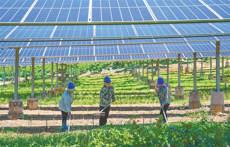 近日,在位于三亚市南滨居的大唐三亚红星光伏发电站,4米多高的光伏板整齐排列在田地间。该发电站是目前三亚单体容量最大的光伏项目,占地1128亩,搭建14万块光伏发电板,电站年均发电量1亿千瓦时。同时利用光伏板下空间发展农业种植,目前已完成300亩种植,为周边100多名农户提供了就业岗位。文/本报记者 徐慧玲 图/本报记者 王程龙