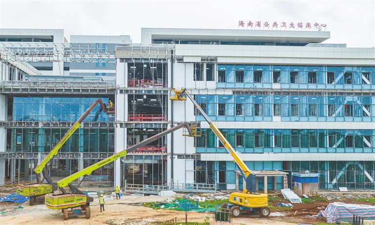 近日,在海南省公共卫生临床中心项目施工现场,工人加紧作业,全力推进项目建设。据了解,该项目已完成主体结构、二次结构施工,以及机电工程、幕墙工程大部分施工,正积极推进装修工程等工作。本报记者 袁琛 通讯员 边震 华皓宇 图/文