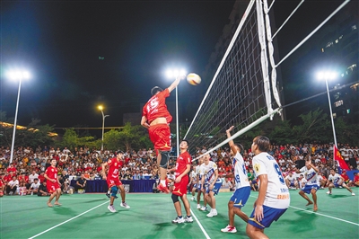 7月21日晚,2023年“九九杯”海南(文昌)乡镇排球联赛铺前站小组赛在“中国排球之乡”文昌市铺前镇铺前中心小学开打。图为文昌锦山镇和抱罗镇代表队展开激烈角逐。