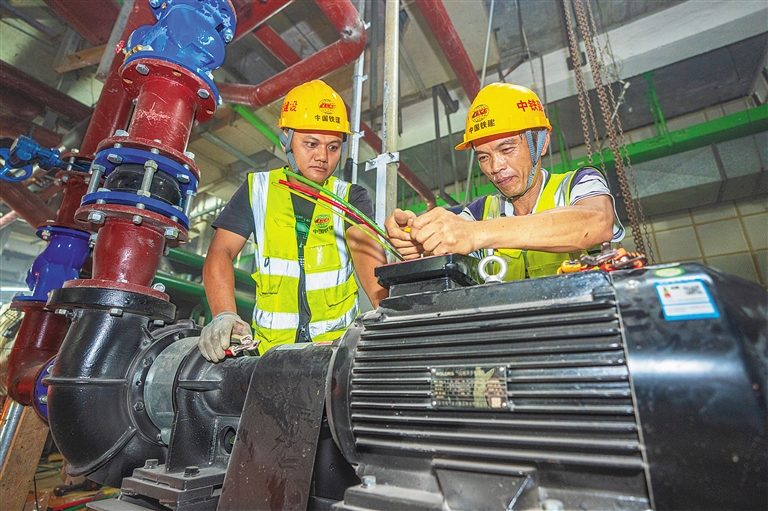 7月20日,由中铁建设集团承建的海南博鳌零碳示范区建筑绿色化改造项目施工现场,工人在压接水泵电缆。