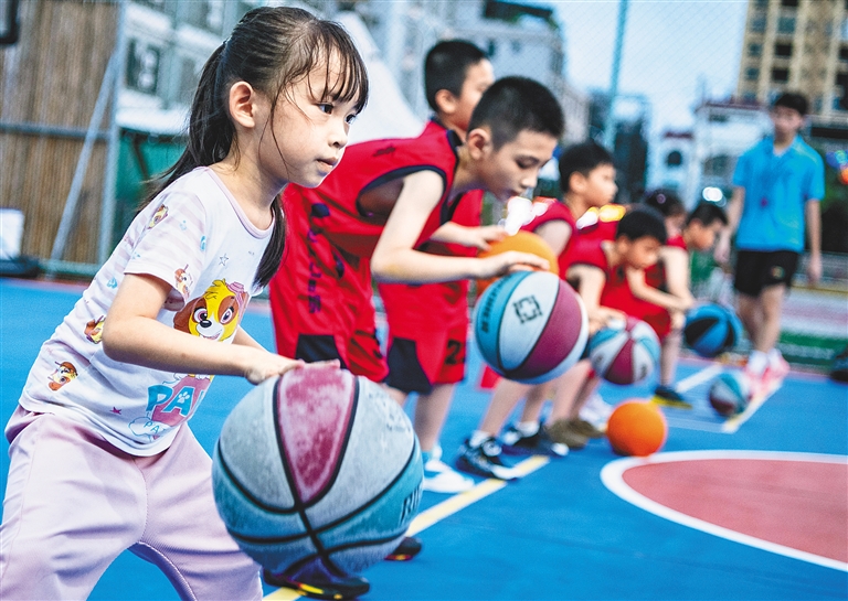 7月18日,琼海市的学生在万泉河广场学习打篮球。