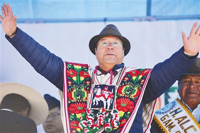 7月20日,在玻利维亚奥鲁罗,玻利维亚总统路易斯·阿尔塞在科伊帕萨盐沼参加活动。